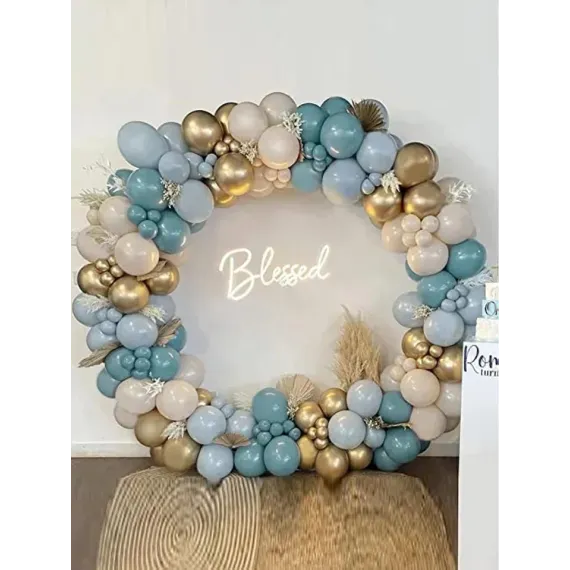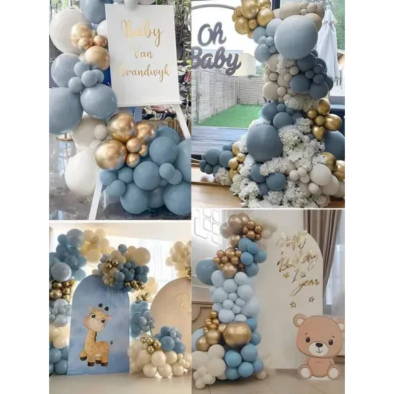 Transformă orice petrecere într-un decor de vis cu acest set generos de 151 de baloane, ideal pentru aniversări, botezuri, baby showers sau evenimente tematice! Paleta elegantă de culori pastelate – bleu prăfuit, alb perlat, crem cald și accente aurii – creează un efect vizual spectaculos, perfect pentru fotografii memorabile.